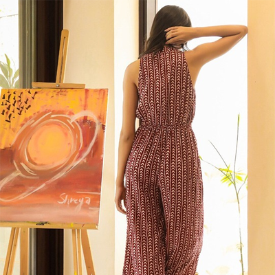 "Maroon and white printed basic jumpsuit ,has a round neck, sleeveless, 2 pockets Size & Fit The model (height 5'8) is wearing a size S Material & Care Silk Hand wash"