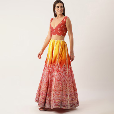 "Multicoloured solid lehenga choli with dupatta, Multicoloured solid unstitched blouse, has a v-neck, sleeveless, multicoloured solid semi-stitched lehenga, has drawstring closure, flared hem Multicoloured printed dupatta, solid border Size & Fit Dupatta Length :- 2.4 meter,Lehenga Length :- 41 inch,Blouse Length :- Unstitch 1 meter Material & Care ,Dry Clean only"