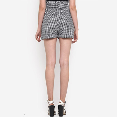 "Black and White Plus Size Checkered cotton shorts has a slip-on closure with drawstring, 2 side pockets and ruffled high waist cotton shorts Comes with a belt Size & Fit Regular Fit The model (height 5'8) is wearing a size 38 Material & Care Cotton Machine Wash"