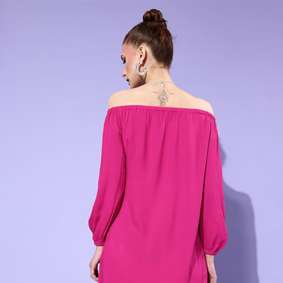 "Add a touch of class to your style with this sophisticated dress. This dress comes with a solid pattern and an off-shoulder design for an enhanced appeal. Pink shade Solid pattern Off-shoulder Long cuffed sleeves Viscose rayon, machine wash Trend Alert The 70s mini refers to apparel that is designed with a short length and feature details, like cutouts, bodycon, plunge necklines, tie-ups, knotted, halter necklines, and more that signify the 70s raves. Prints and patterns, such as colour-blocking, checks, psychedelic trails, florals, sunflowers, etc. further accentuate their appeal. Size & Fit The model (height 5'8) is wearing a size S Material & Care 100% rayon Machine Wash"