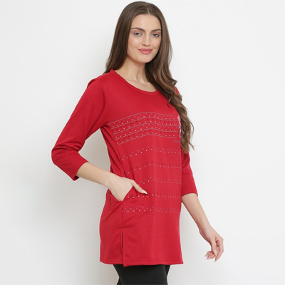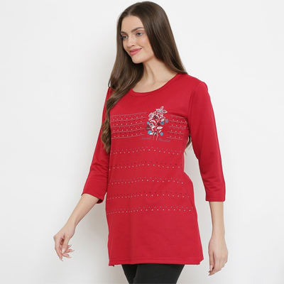 "Red longline regular top Floral print Round neck, long, regular sleeves Woven Size & Fit The model (height 5'8) is wearing a size S Material & Care 60% Cotton, 40% Polyester Machine Wash "