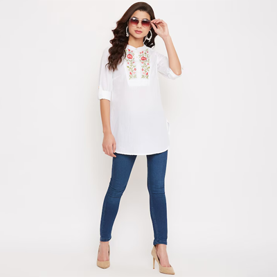 "White and red embroidered tunic has a mandarin collar, long sleeves, embroidered detail, and button closure Size & Fit The model (height 5'8) is wearing a size S Material & Care Cotton Machine wash"
